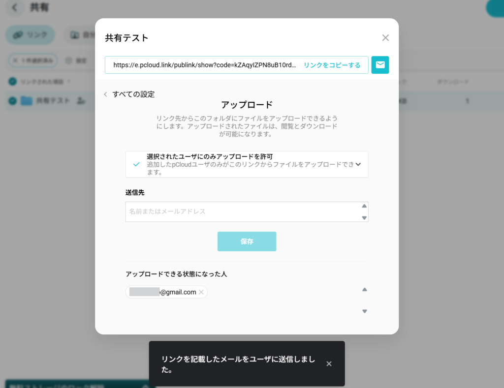 5. アップロードを許可したい相手のメールアドレスを入力して「保存」を押します。
