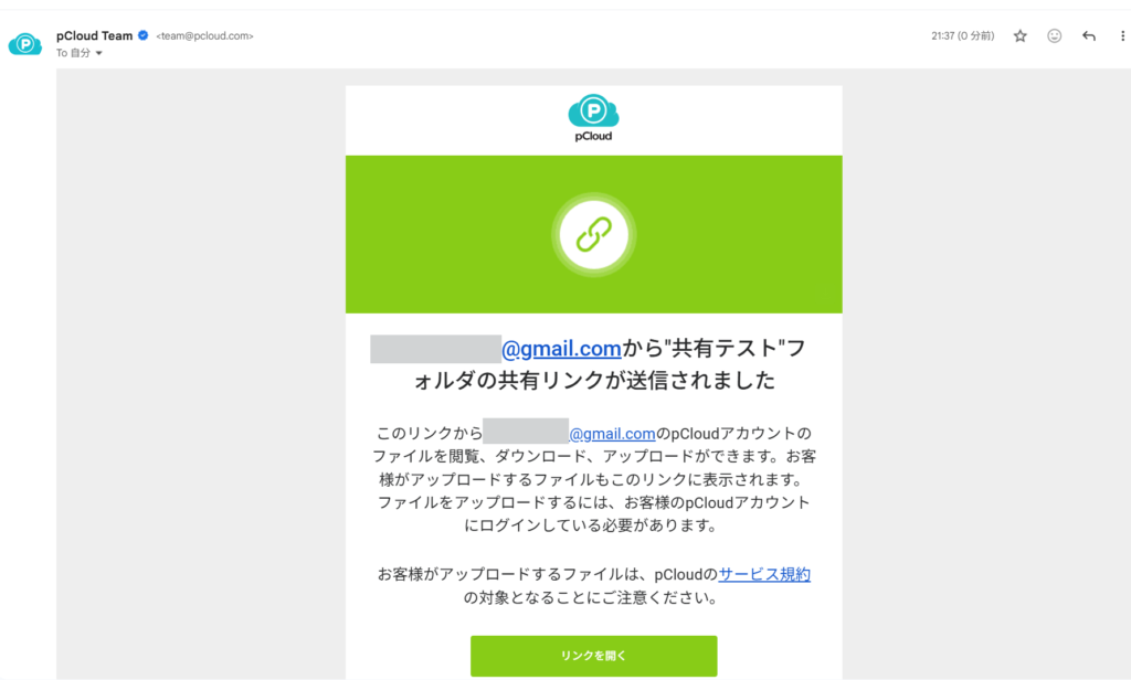 6. [共有される側の対応] 選択したメールアドレス宛に pCloud からメールが送信されるので「リンクを開く」を押します。