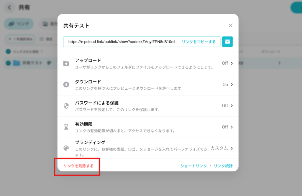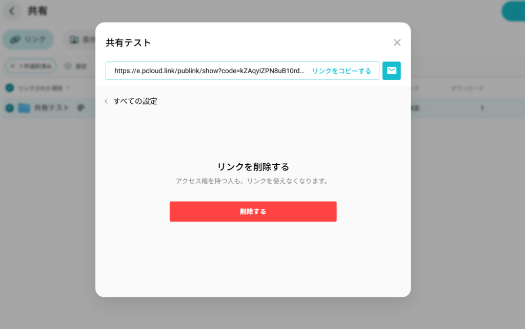 1. 左のメニューから「共有」を選択して上のタブから「リンク」を選択すると、共有したリンク一覧が表示されます。