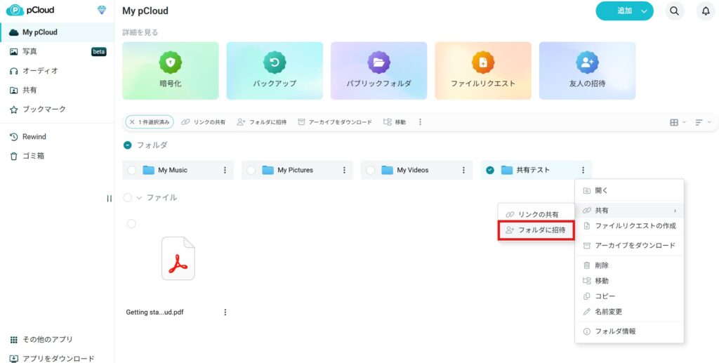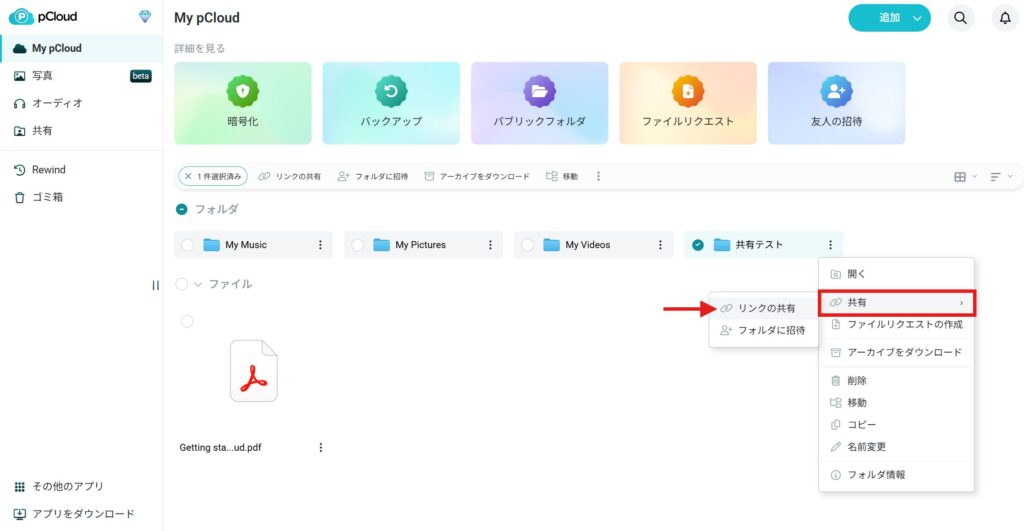 ここでは、実際に pCloud でデータを共有する手順を「リンクの共有」と「フォルダに招待」それぞれについて解説していきます!