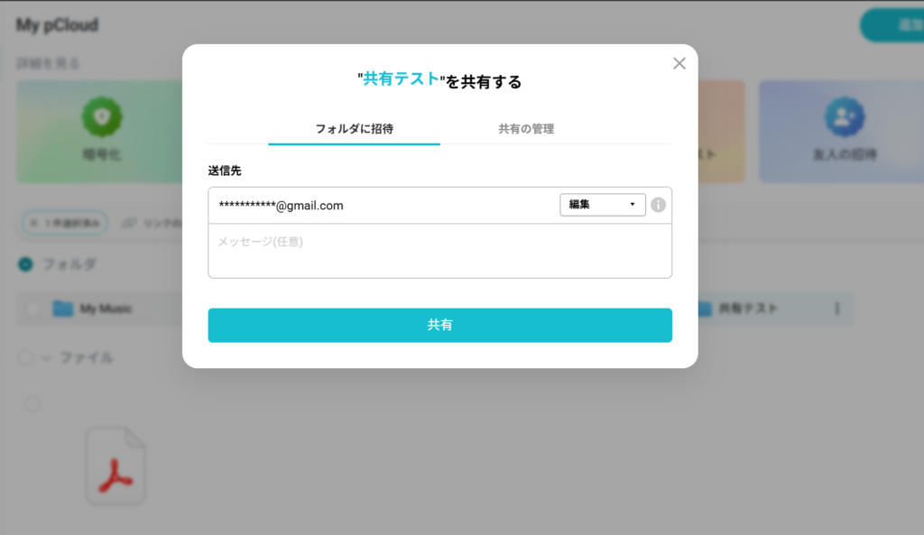 2. 共有したい相手の pCloud アカウントのメールアドレスを入力して「共有」を押します。