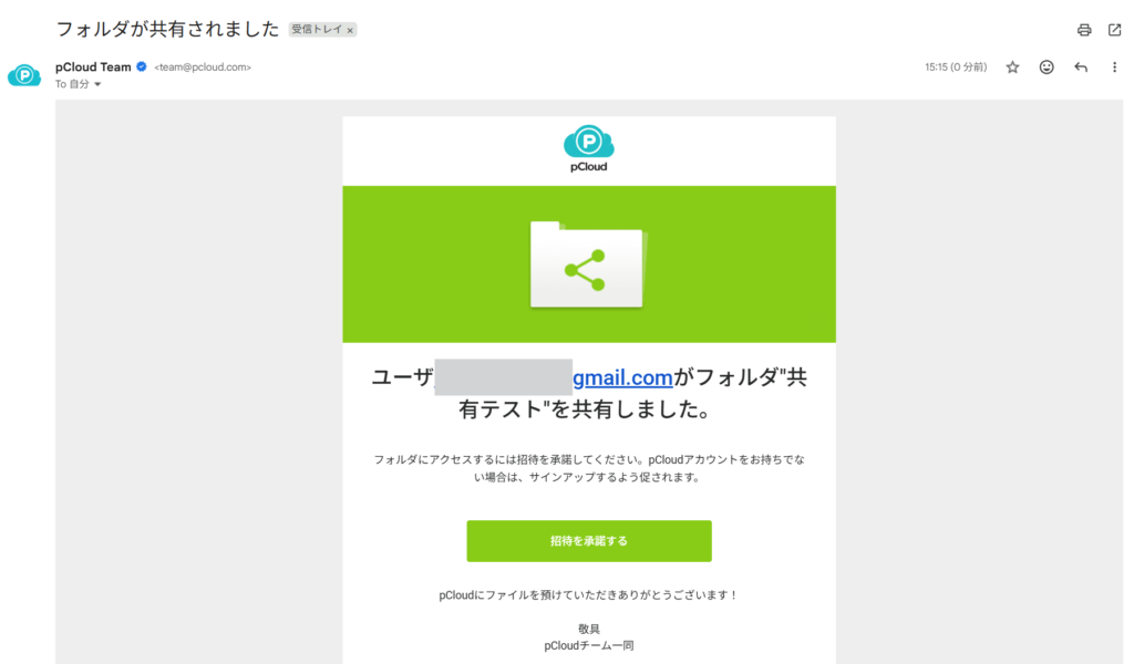 3. 2で入力したメールアドレス宛に pCloud からメールが届くので、「招待を承認する」を押します。