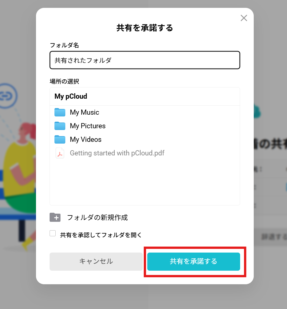 6. 共有フォルダを設置する場所と名前を入力して「共有を承諾する」を押します。