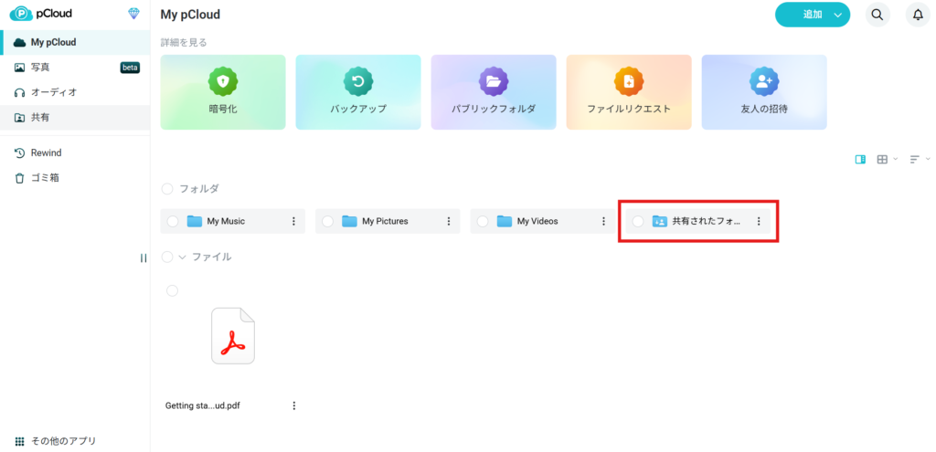 7. 共有されたユーザーの pCloud に 6 で入力した名前のフォルダが作成されます。