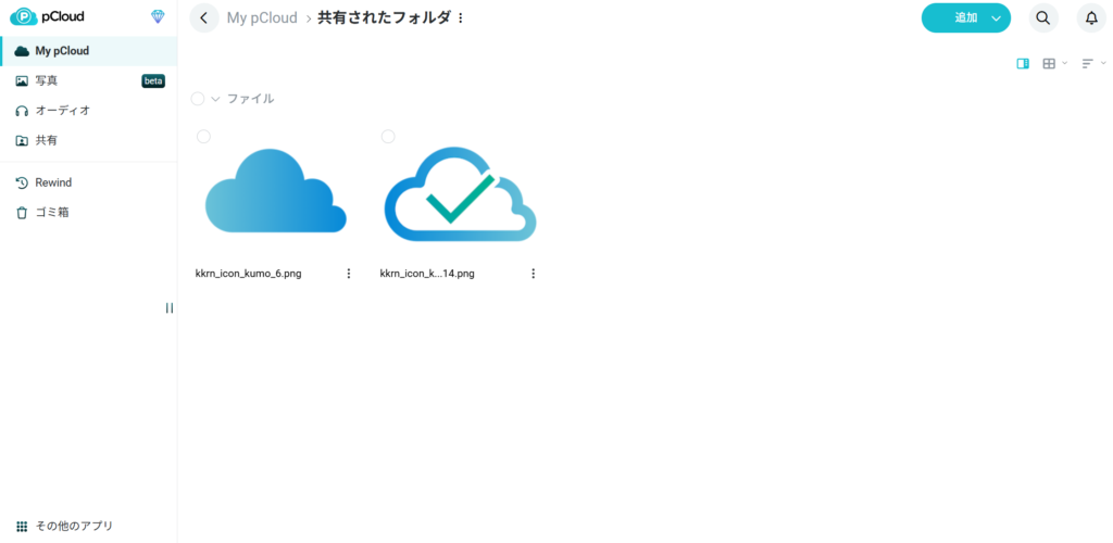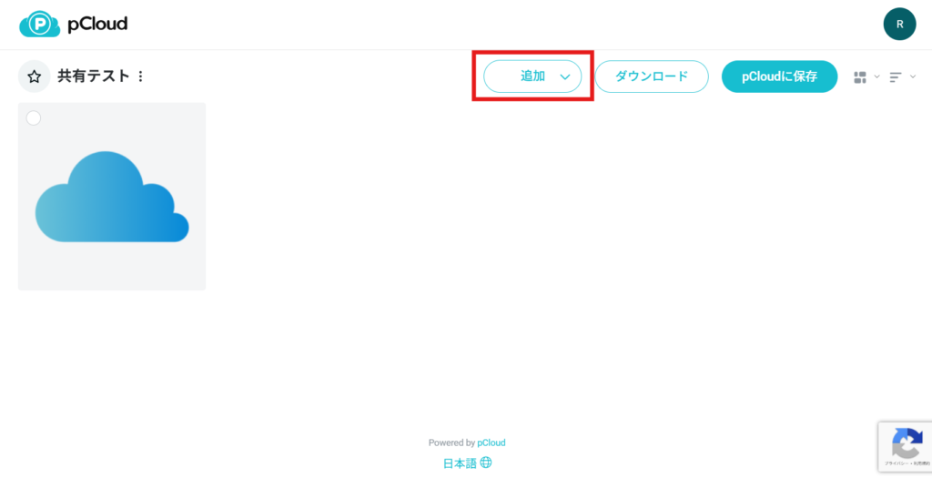 8. pCloud アカウントにログインすると「追加」ボタンが表示されます。