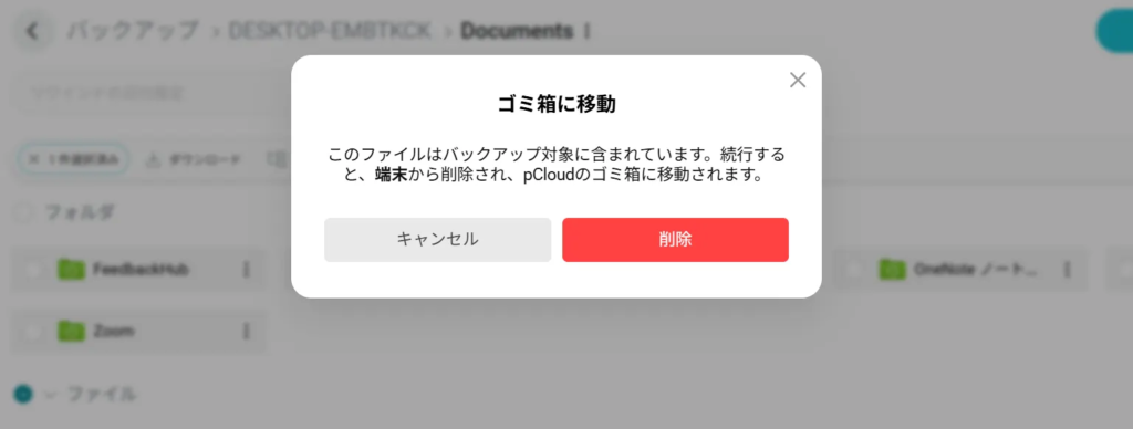 バックアップ機能では、バックアップ対象のファイルを pCloud 上で削除しようとすると警告ポップアップが表示されます。