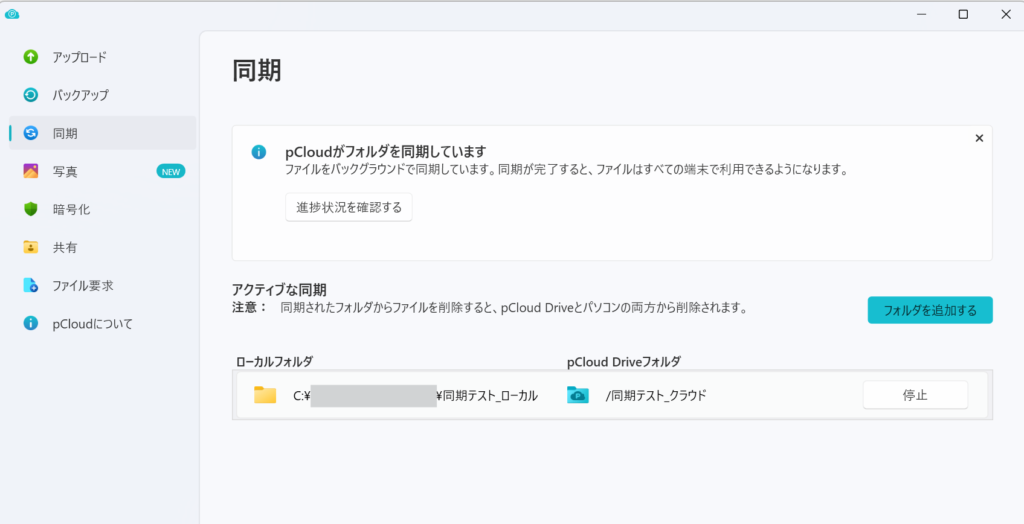 ローカルフォルダと pCloud 側のフォルダをそれぞれ指定するようになっている。